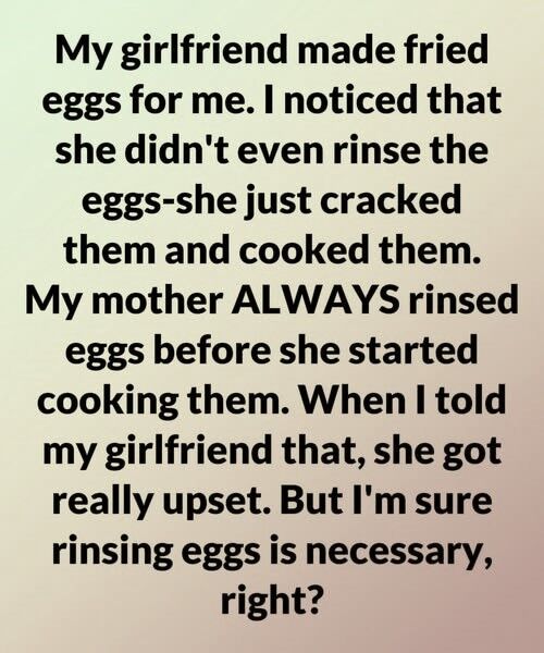 “Shouldn’t you rinse them first?” he asked casually, nodding toward the eggs. “My mom always did.”