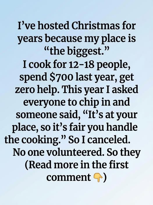 This time, I decided to speak up. I suggested that everyone contribute somehow—bring a dish, chip in for groceries, lend a hand in the kitchen. The room went awkwardly quiet. A few polite nods, a half-hearted joke. Then someone said, almost dismissively, “Well, since it’s at your house, it makes sense that you handle the cooking.”