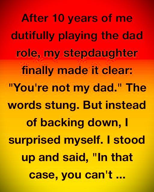 “You’re not my dad.” She said it like a switch flipped. Ten years of scraped knees, school plays, and heartbreaks—all erased. I didn’t get angry. I told her calmly: “Then you don’t get to treat me like a punching bag.” She wasn’t used to me pushing back. Slammed door. Silence. Later, Claire said, “She’s hurting. At her dad. At me. Maybe at you—because you stayed.”