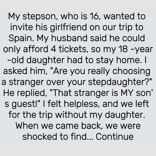 I never imagined a family vacation could tear us apart. My 16-year-old stepson recently started dating, and he excitedly asked if he could bring his new girlfriend on our upcoming trip to Spain. My husband, eager to make him happy, agreed—but with a catch: he said he couldn’t afford more than four tickets. That meant my 18-year-old daughter, whom I’ve raised since she was seven, would have to stay home.