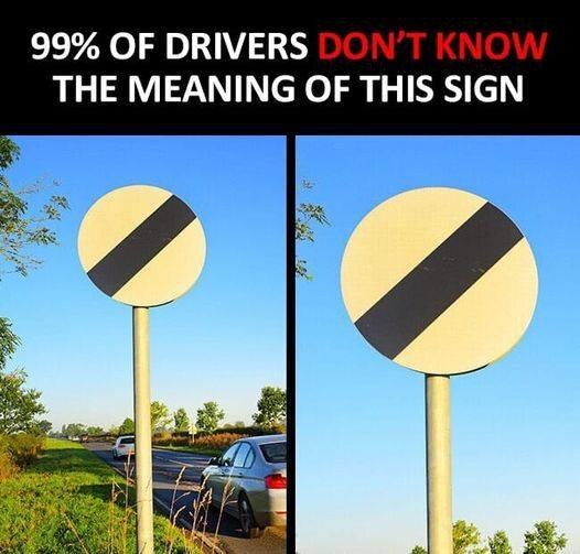 The national speed limit sign tells you that you’ve now entered a stretch of road where the default national speed rules apply, rather than the lower limit that may have been in force earlier.
